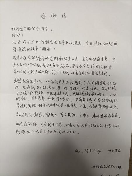 湖南教育新闻网讯(通讯员 杨冰倩)有一种美德叫拾金不昧,有一种惊喜叫失而复得,俯身拾起是美德,昂首送还的是真心。近日,株洲市芦淞区体育路中学收到了一封情真意切的感谢信,纸短情长,字里行间表达着失主对吴锦鹏同学拾金不昧的感谢。