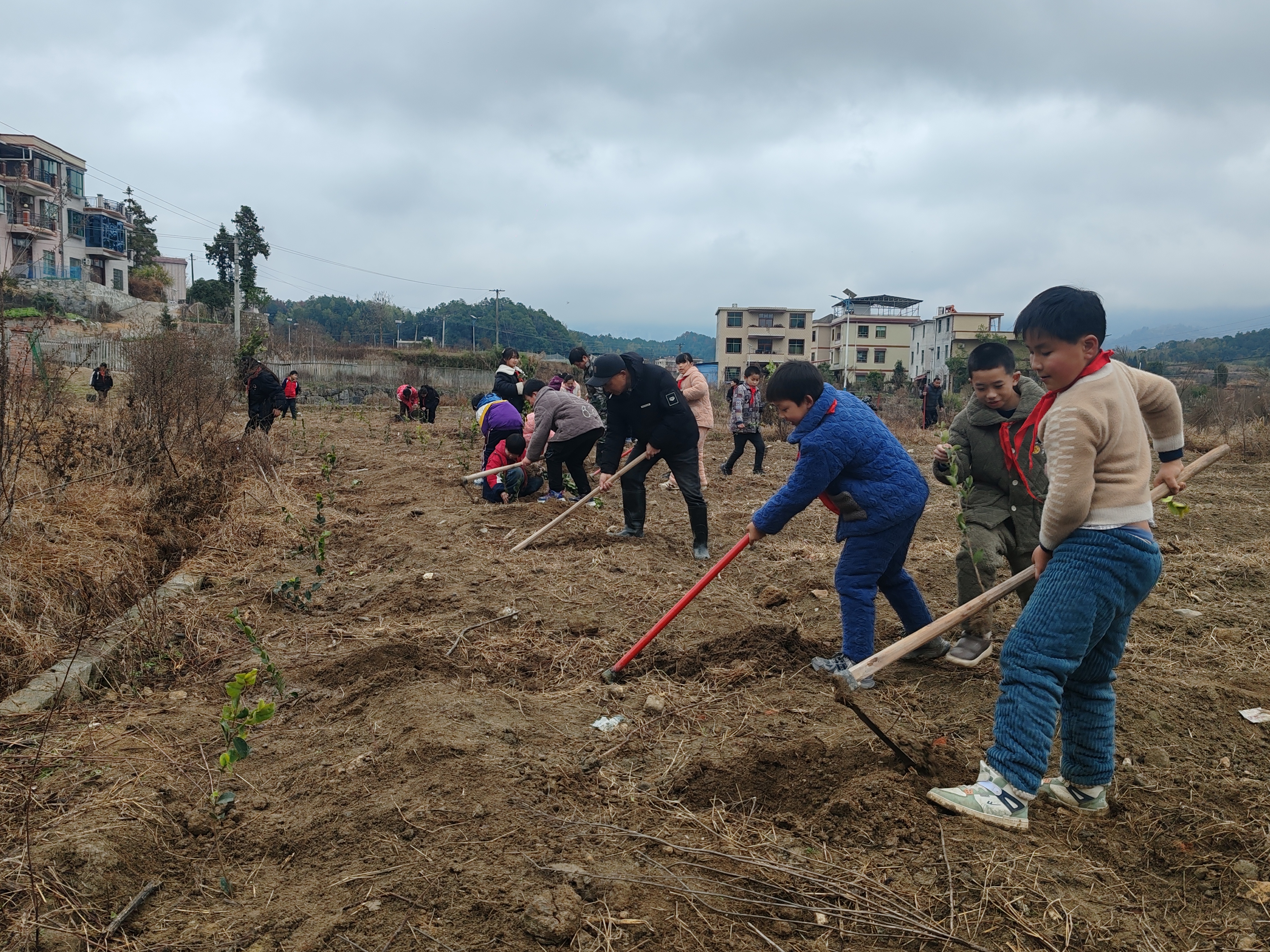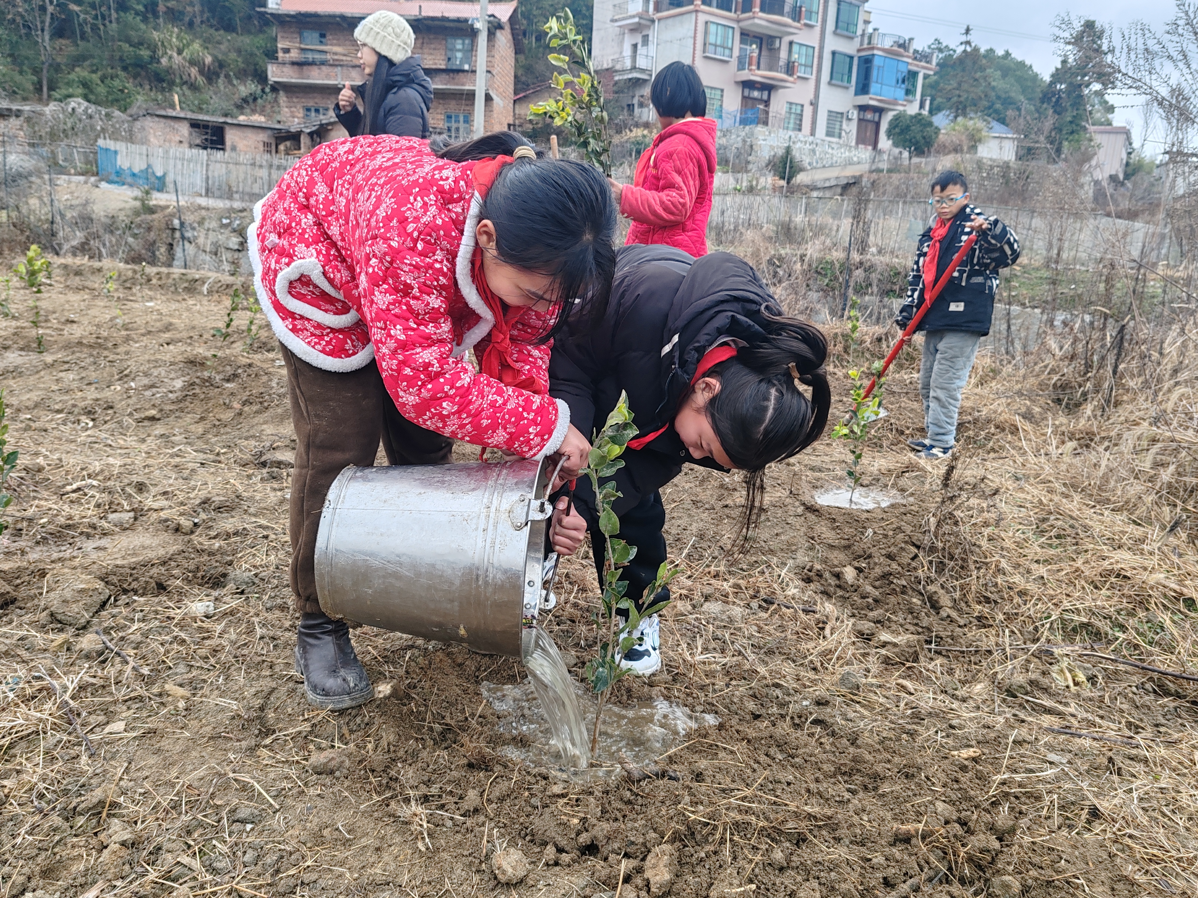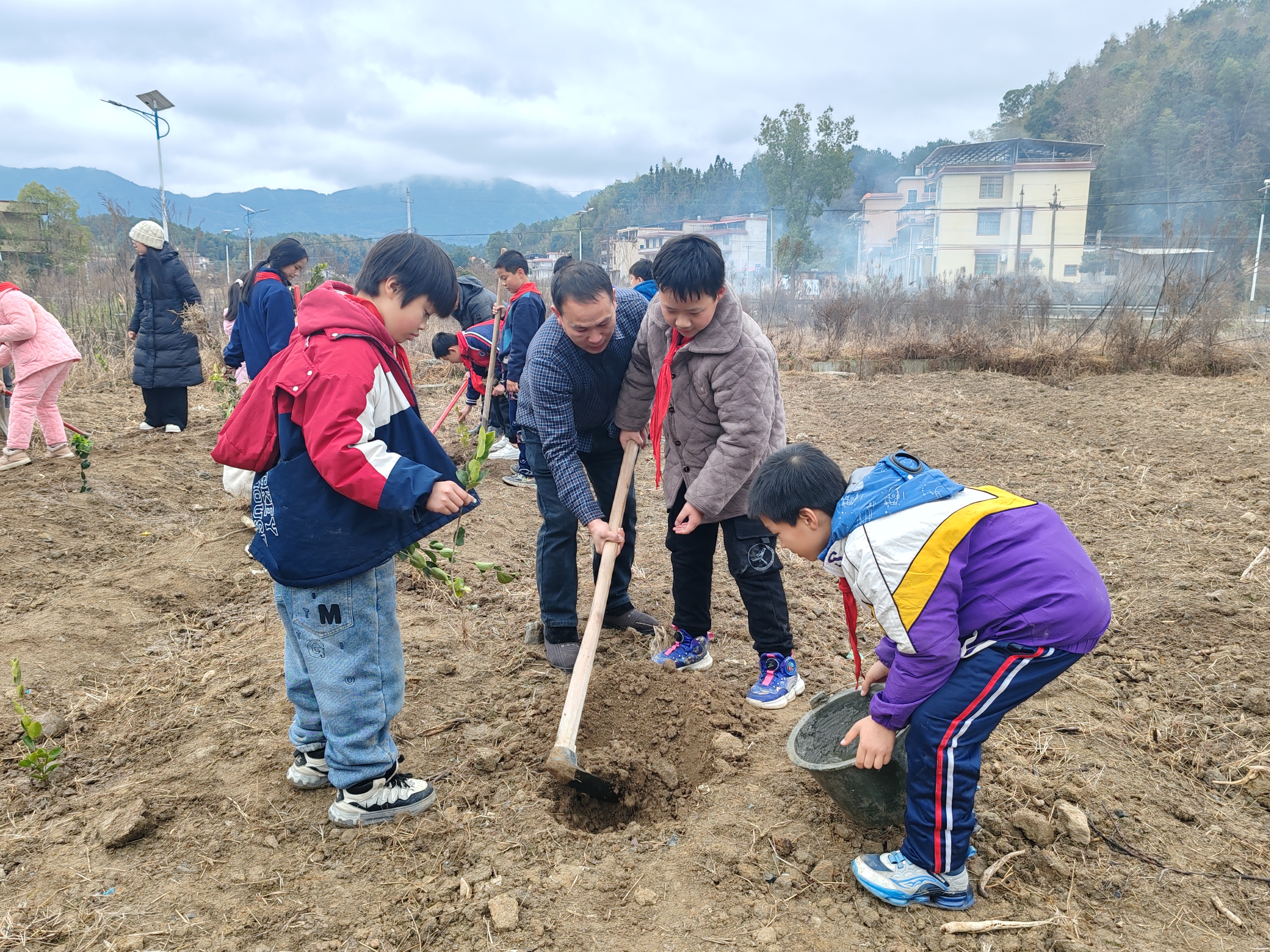 挖坑、栽苗、培土、浇水,大家分工合作、互帮互助,原本空旷的基地很快就布满了忙碌的身影。经过90分钟左右的奋战,300棵油茶树苗整齐地扎根在3亩土壤中,迎风挺立,为冬日的劳动基地增添了一抹生机盎然的新绿。五二班的宁康同学说:“栽树苗不仅要横平竖直,间隔距离也得恰到好处,这样才能保证每棵树苗都能充分接收阳光、吸收养分!”