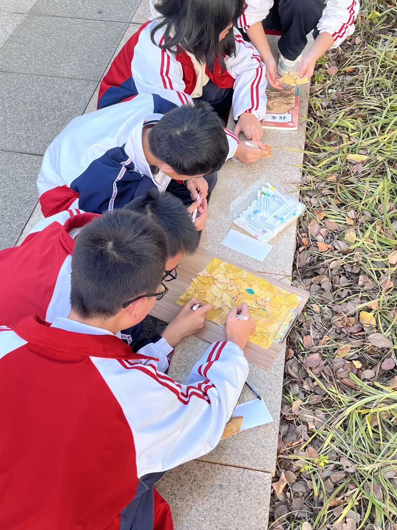 校园里已不复深秋的绚烂,枝头疏朗,地面零星散落着最后的叶片。同学们弯腰拾起片片银杏叶,有的小心翼翼地将叶子夹进画夹,有的举起叶片对着阳光细数叶脉的纹路。银杏树下,同学们三五成群围坐在一起,有的同学拿起画笔,认真描摹银杏叶微卷的弧度;有的将不同形态的叶子拼贴组合,创作出富有想象力的冬日图景。