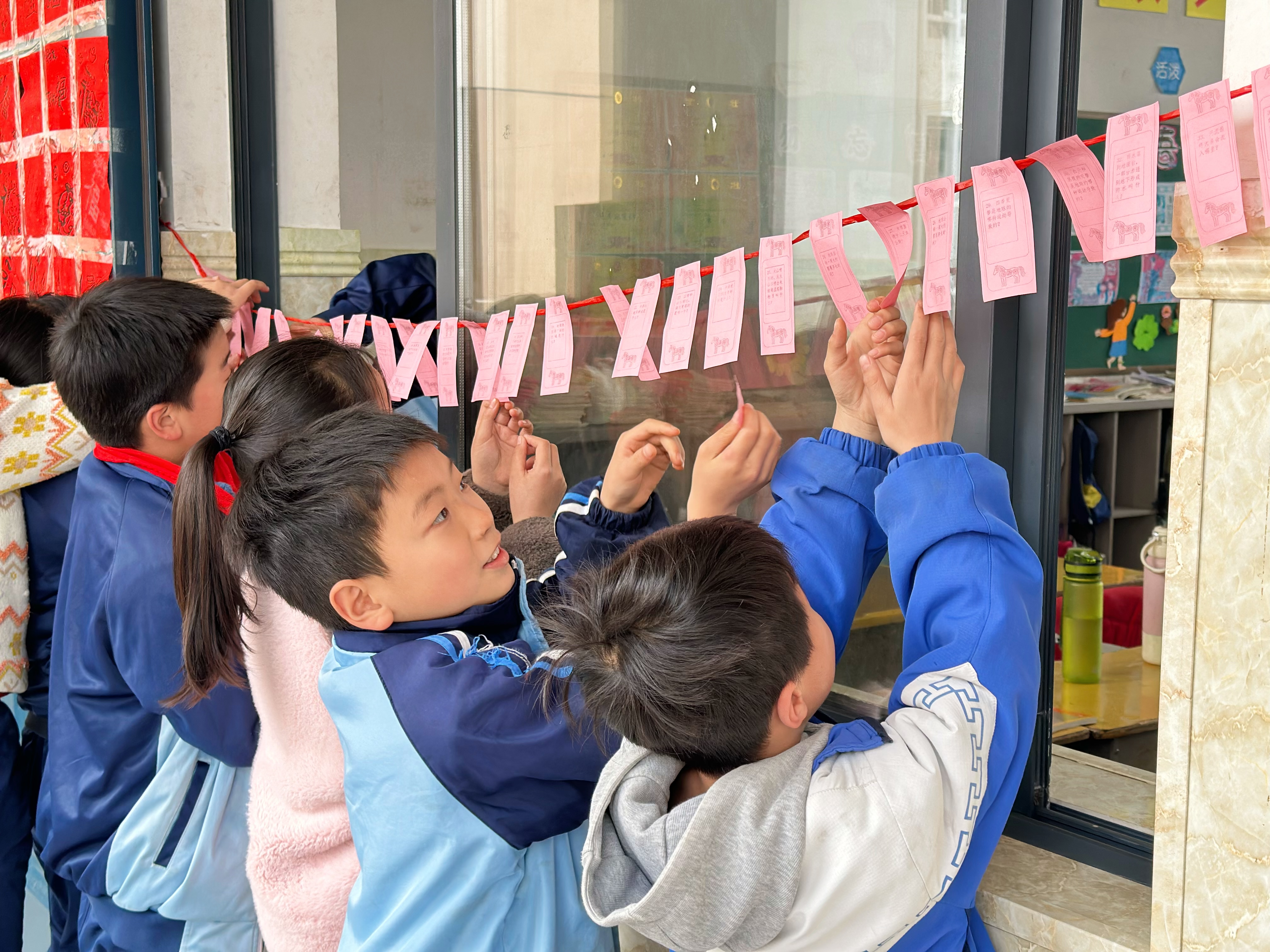 各班教室走廊变身“灯谜长廊”,寒假读物化作趣味试题,学生自由浏览、扯下谜面答题。“知识竞答+实物奖励”的设计让寒假阅读成果瞬间“变现”,同学们争先展示“战利品”。“你的心愿我来祝福”创作赛更是创意十足——学生抽取书中人物卡片,结合性格写专属祝福语。“猪八戒,祝你马年能吃好喝好,一马平川到西天!”妙趣横生的作品引来阵阵欢笑。