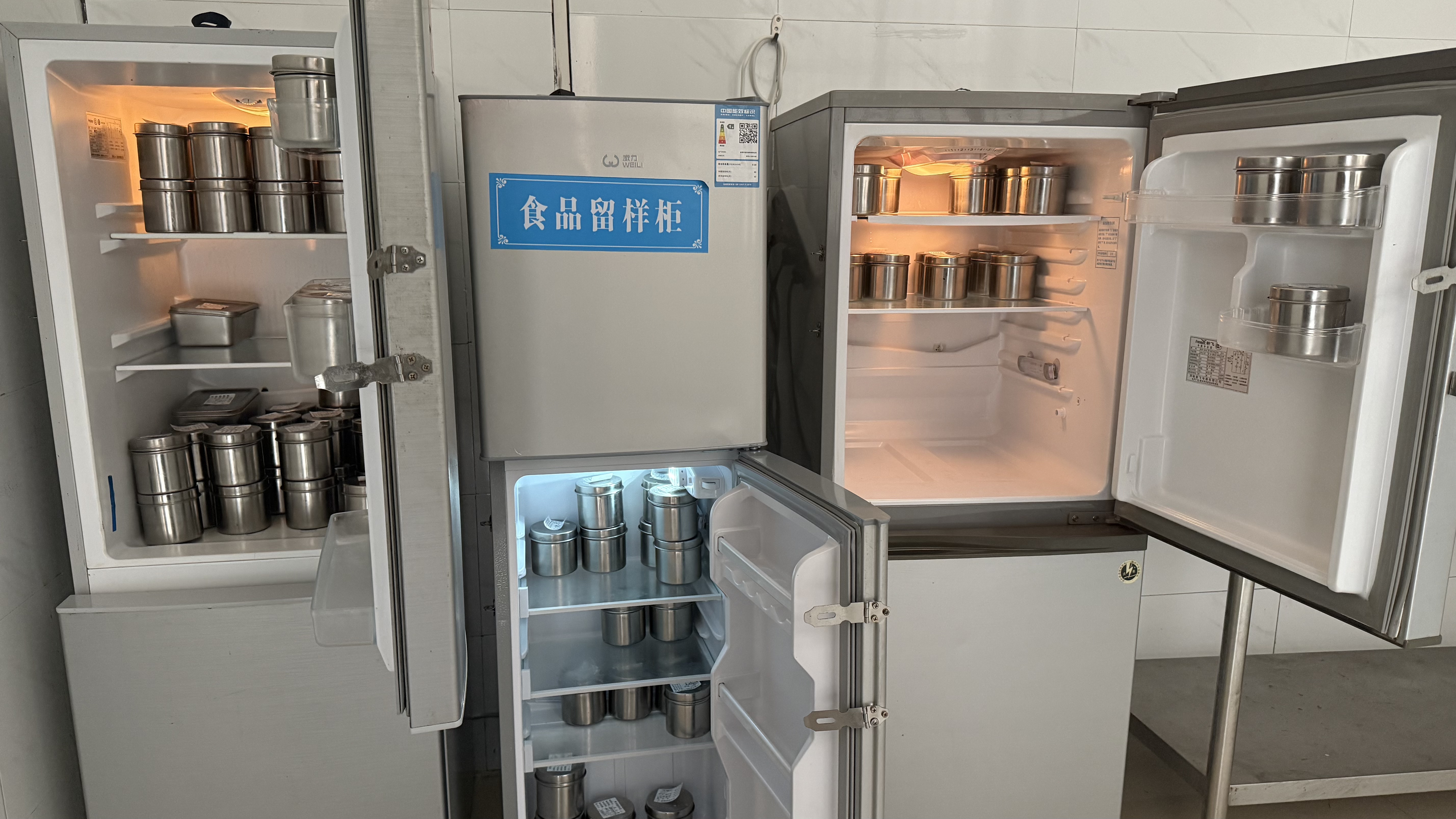 粗加工区里,红、绿、蓝三色砧板和刀具有序摆放,成为食安管控的亮眼细节。当小记者追问颜色区分的意义时,刘喜军详细讲解:这是严格执行的色标管理制度,红色专切肉类、绿色用于蔬菜、蓝色对应水产,从工具使用上杜绝交叉污染,牢牢守住加工安全关。食品留样柜内,每份菜品均称重不少于125克,标注清晰的留样与销毁时间,密封保存48小时,为食品安全追溯提供关键支撑。