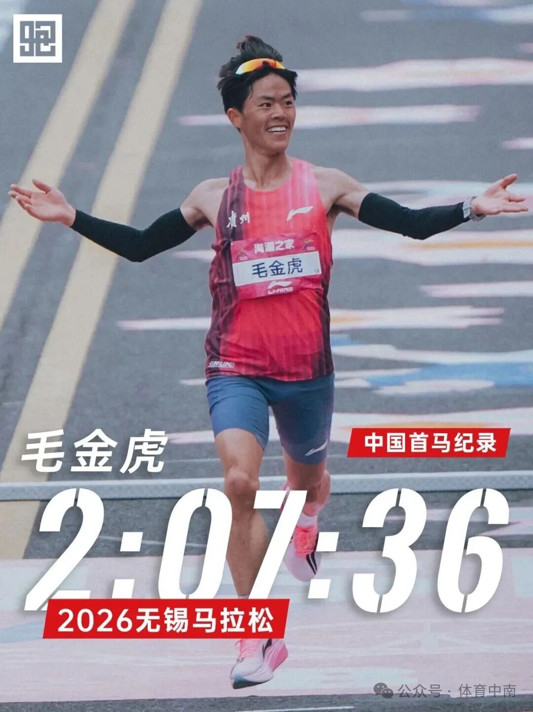 湖南教育新闻网讯(通讯员 韩艳) 3月22日,在无锡马拉松比赛上,中南大学体育教研部运动训练专业2024级本科生毛金虎以2:07:36的成绩完成自己的全马首秀,获得中国籍选手第一名、全场亚军,大幅度打破国内男子选手首马纪录(原纪录2:12:17,1987年)。此外,不久前刚在东京马拉松以2小时05分58秒刷新全国纪录的中南大学体育教研部运动训练专业2024级本科生丰配友,以2:08:10的成绩获全场第四、国内第二。