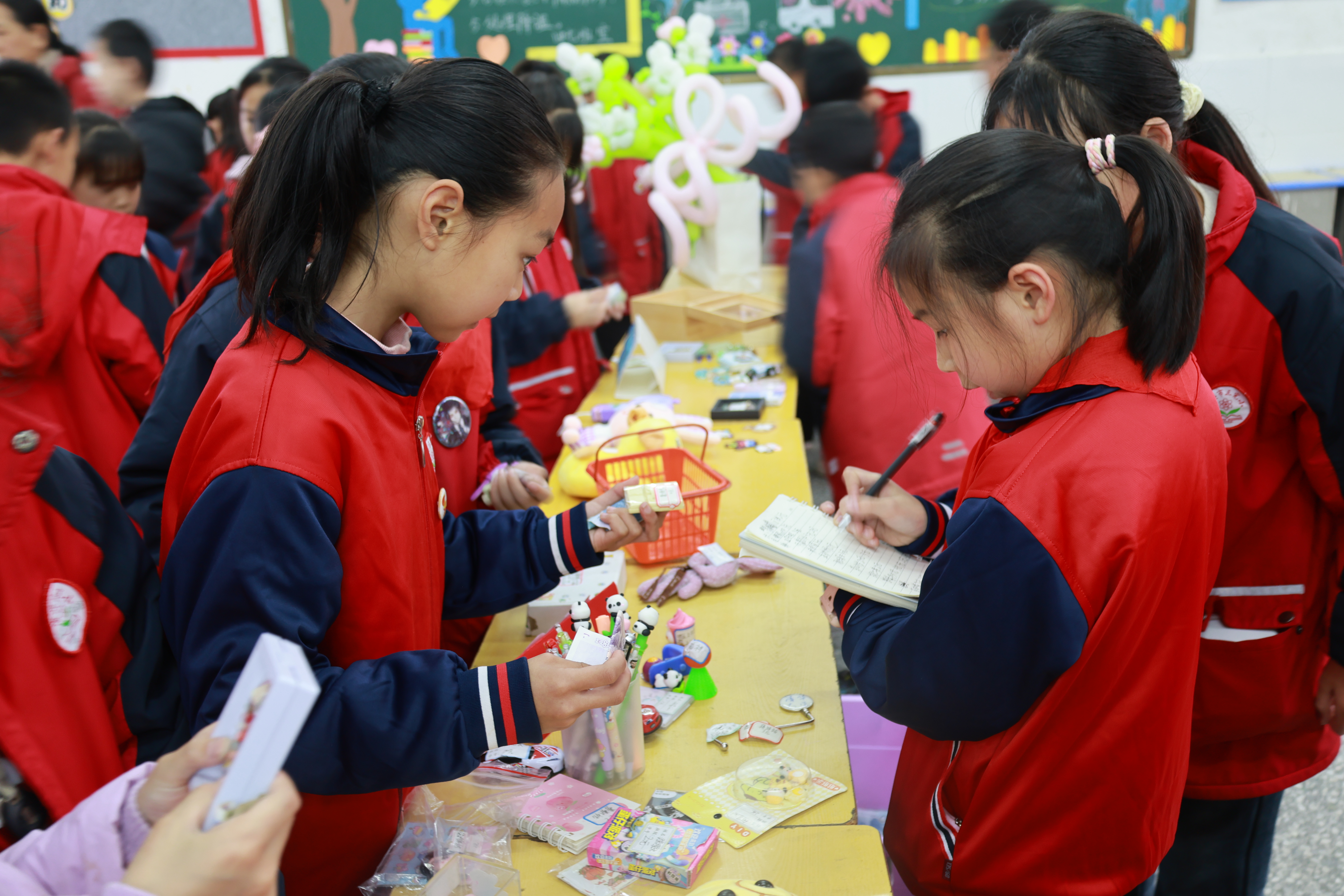 “走过路过不要错过!”“爱心好物便宜卖啦!”一声声稚嫩又热情的吆喝声在教室里此起彼伏。各班教室早已被布置成温馨的爱心集市,“书香阁”“童趣屋”等特色摊位整齐摆放,书籍、文具、玩具、手工艺品等闲置好物琳琅满目。小小摊主们各司其职,热情招揽“顾客”,同学们穿梭在各个摊位间认真挑选,讨价还价声、欢笑声交织在一起,整个校园都洋溢着温暖与欢乐的气息。