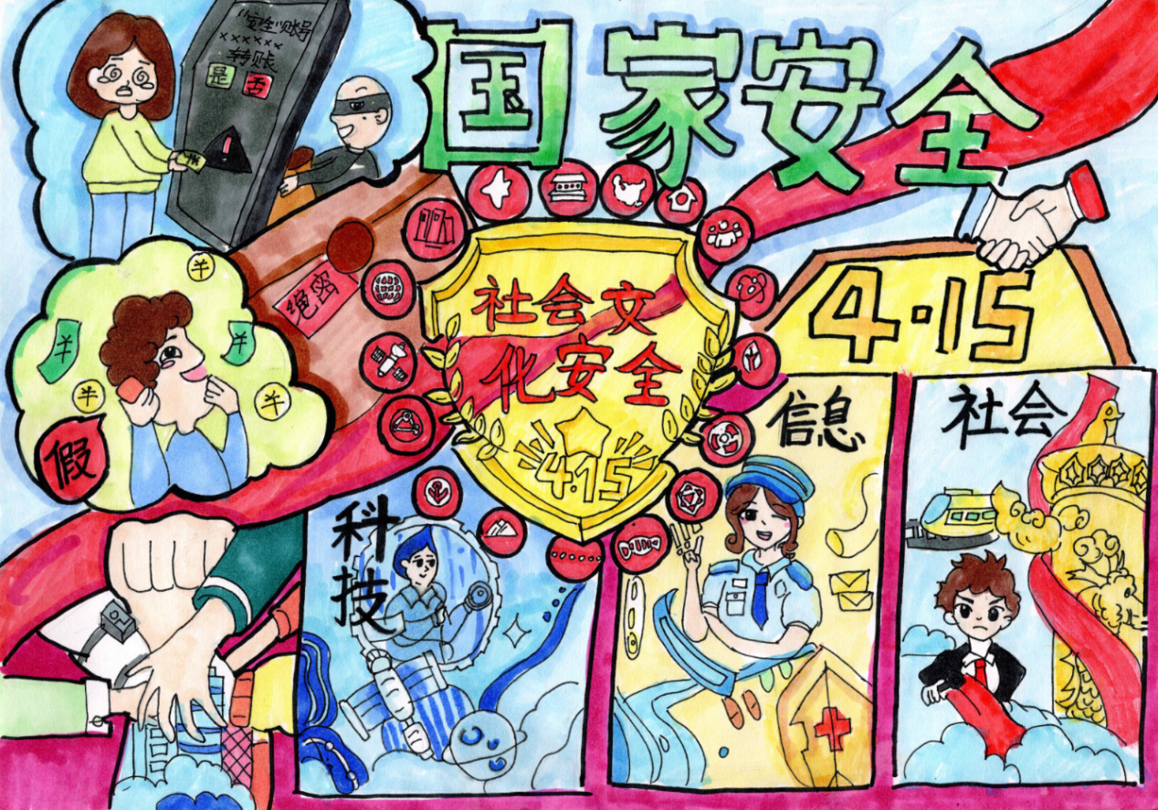活动期间,全校学生积极参与,一幅幅色彩斑斓、创意十足的海报作品,生动展现了孩子们对国家安全的理解与思考。一年级同学用灵动的笔触勾勒出地球与动植物共生的美好画面,呼吁大家守护生态平衡;五年级同学则通过漫画形式,将防范电信诈骗、抵制虚假信息等社会文化安全知识融入画中,直观又深刻。经过班级初选、校级评审,最终按年级评选出一、二、三等奖共66名,优秀作品将在校园内集中展示,让国家安全理念在潜移默化中浸润师生心田。