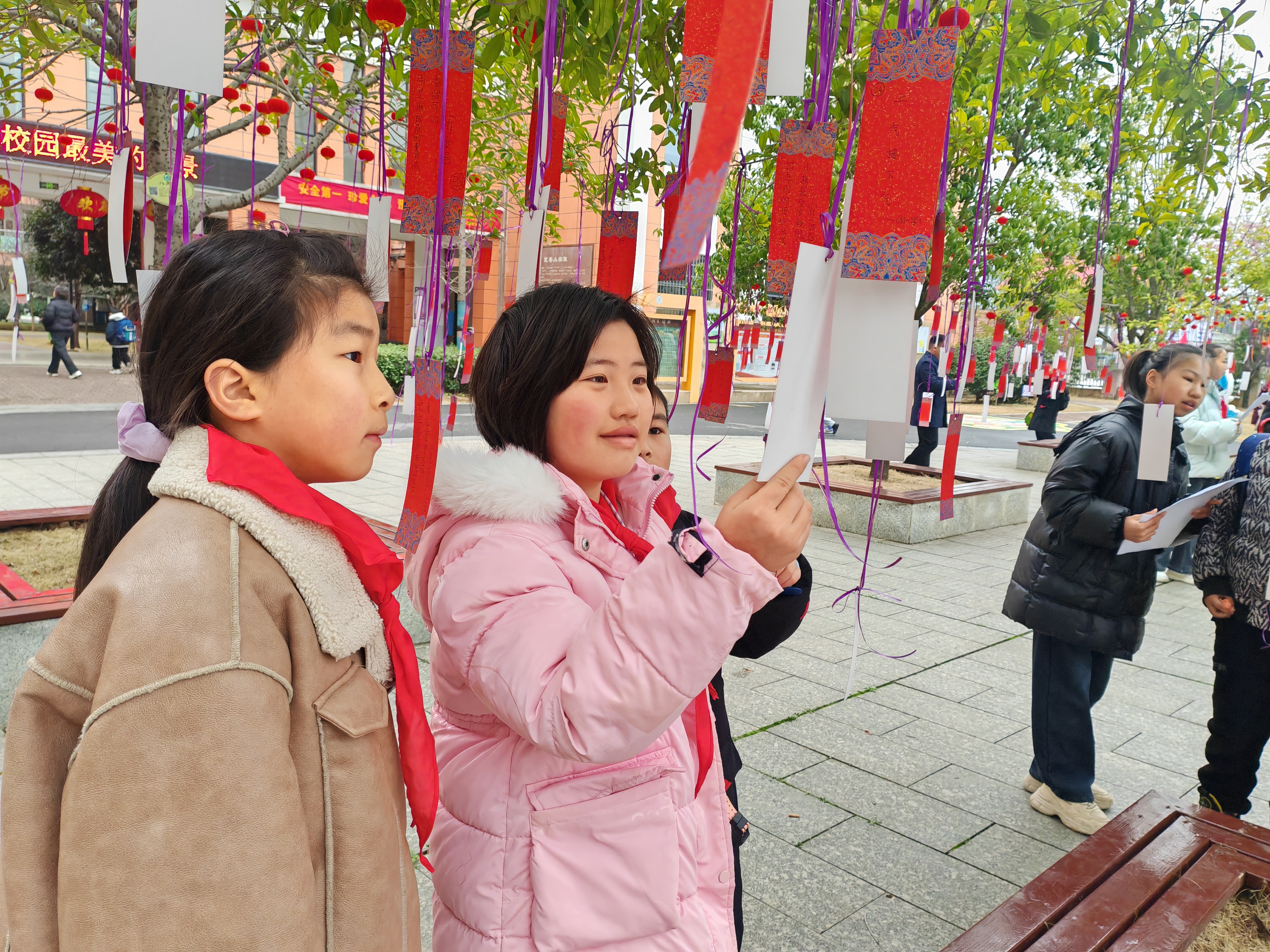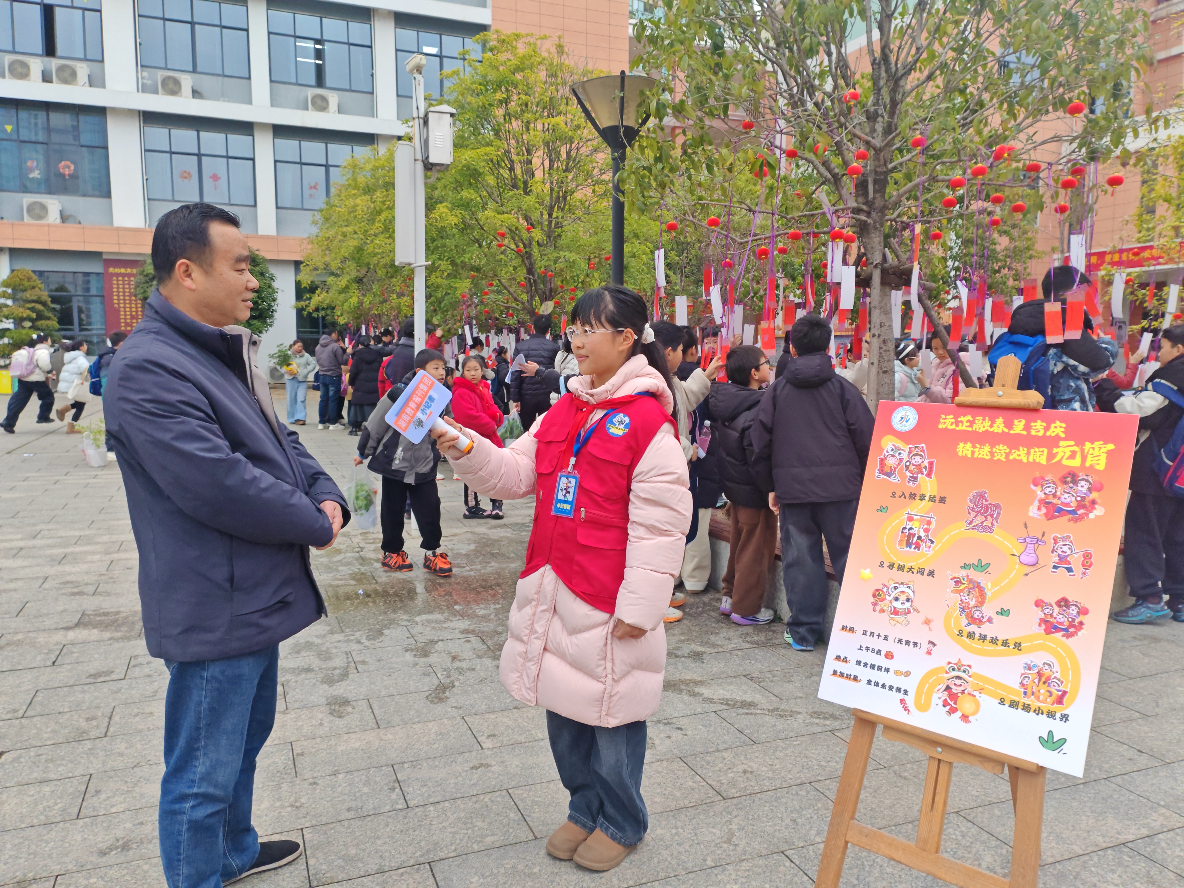 在入校抽签环节,校园主入口的抽签箱前秩序井然,师生们满怀期待地抽取题目卡,一场充满趣味与文化气息的“新春奇遇”正式拉开帷幕。随后,大家有序前往校园内6棵景观树旁,参与“寻树竞猜”环节。该环节精心设置了灯谜、知识竞答、飞花令三大挑战,300道题目涵盖春节元宵习俗、传统文化常识,搭配200个以“春”“月”“灯”为核心的关键字,让师生们在趣味比拼中品味传统知识的魅力,在互动竞猜中传承文化基因。成功通关的师生,可获得专属“元宵通关兑奖牌”,前往前坪领奖区兑换惊喜好礼。
