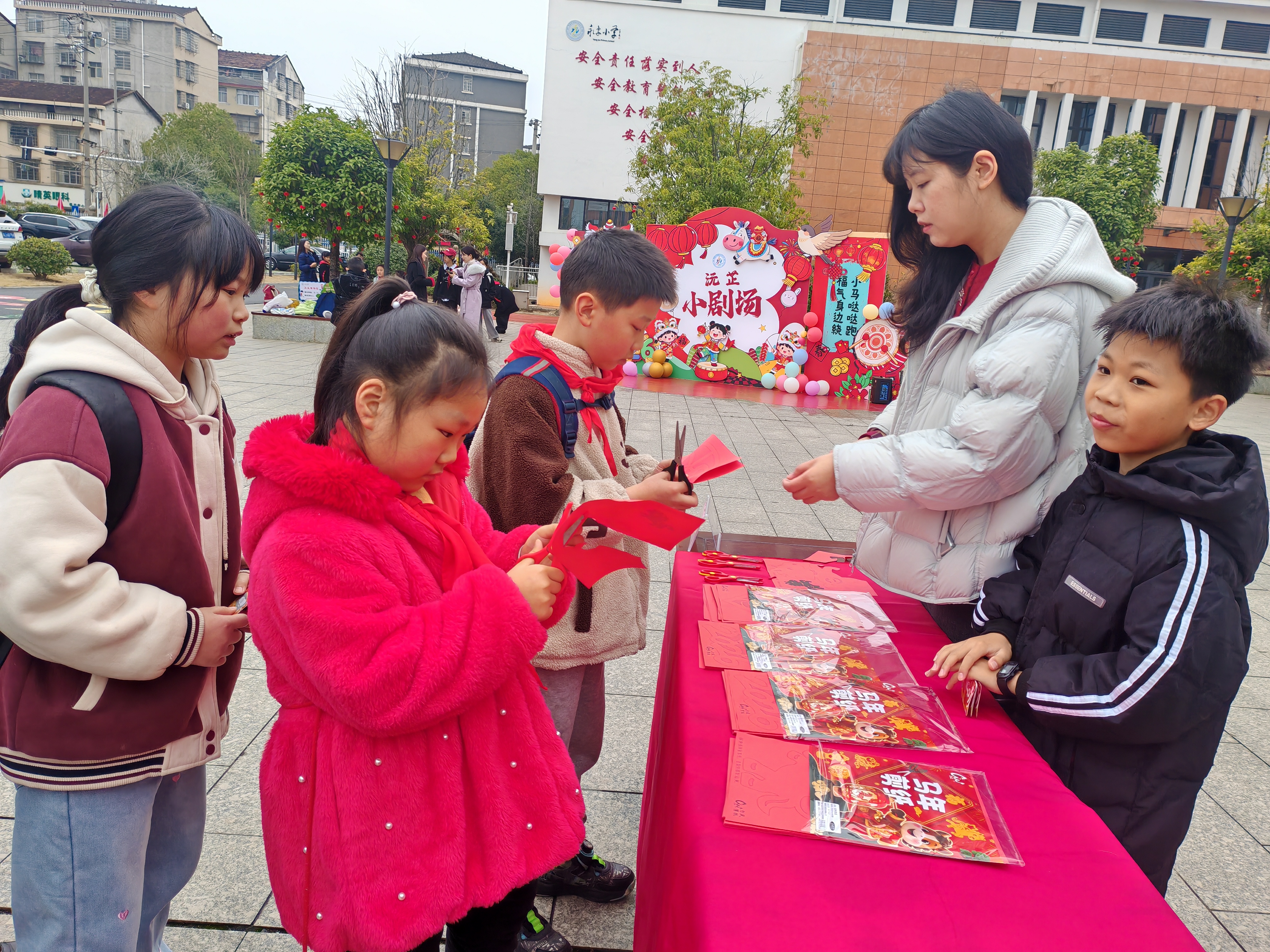 前坪领奖区暖意融融,“新春纳福”“剪纸传情”“新春伴手礼”三大展台人气爆棚、热闹非凡。美术老师现场指导,师生们手持空白剪纸模板,精心创作生肖、福字等剪纸作品,一剪一刻间,寄托着对新年的美好期许;书法老师挥毫示范,大家凝神静气、提笔书写福字与春联,传递着祝福,寓意着“把福气带回家”。即便未能参与现场体验的师生,也能领取到定制书签、红灯笼挂件等新春小礼品,做到人人有份、暖意相伴。