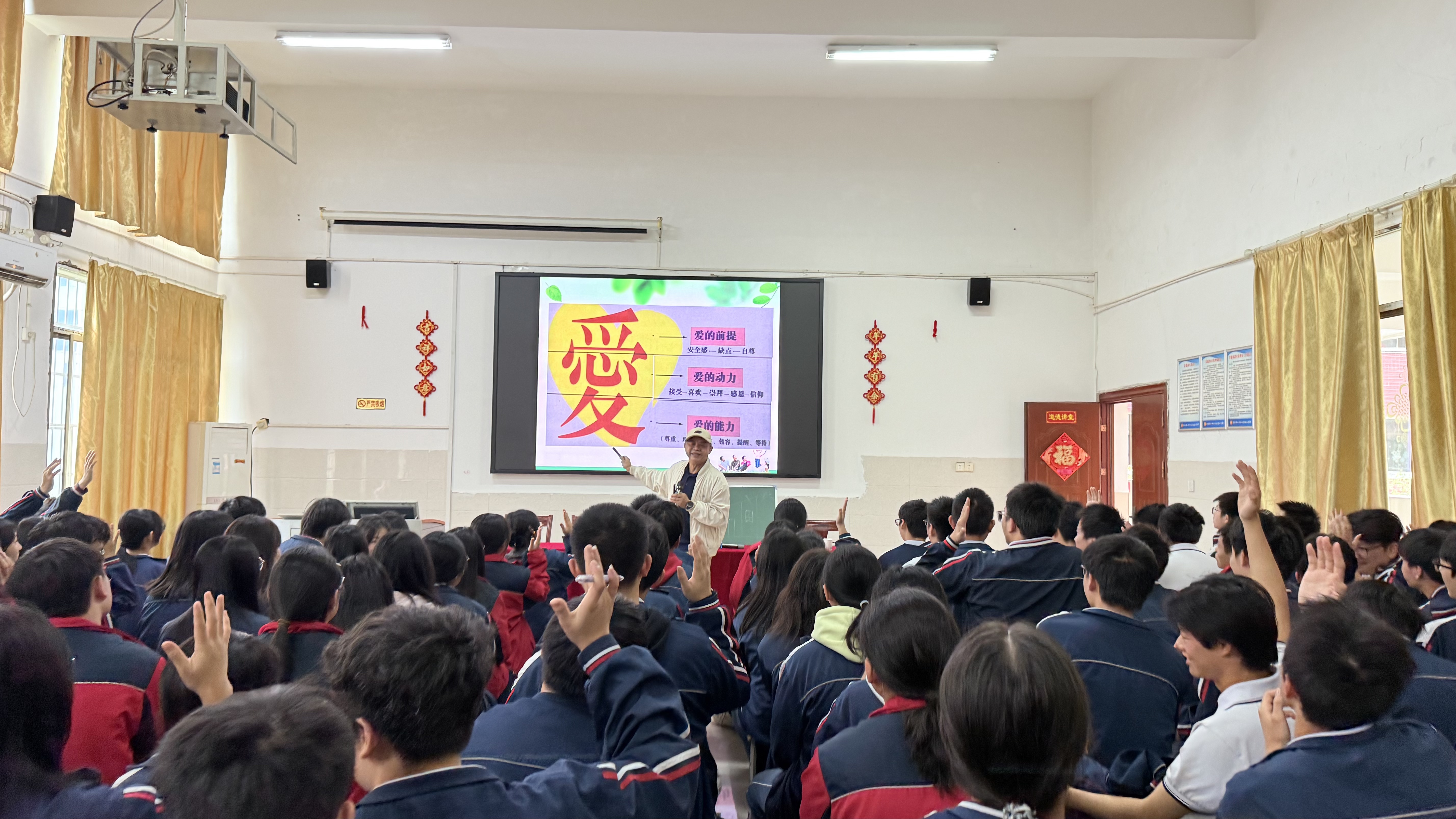 讲座伊始,刘建恒拆解繁体“愛”字,从“爱的前提(安全感、接纳缺点、自尊)”“爱的动力(接受、喜欢、崇拜等)”“爱的能力(尊重、理解、包容等)”三层,带大家读懂爱的内涵。他还设计趣味互动:学生单脚站立时轻轻一推便难以站稳,借此比喻“优点缺点如双腿,缺一不可”,让大家瞬间明白自我接纳的意义。