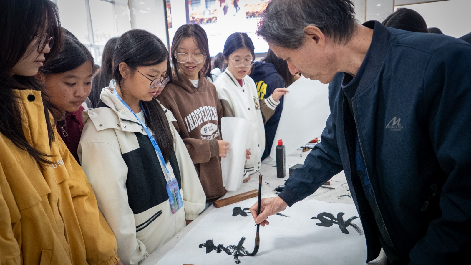 仪式上,彭东寄语学子从笔墨光影中探寻宜章山水神韵与人文底蕴;宜章职校校长李恪云表示展览兼具美育与乡土教育意义,能厚植学生家乡情。现场,艺术家们还向该校学子赠予了30余幅书画作品,并挥毫创作,学子围立观摩,感受传统艺术温度。