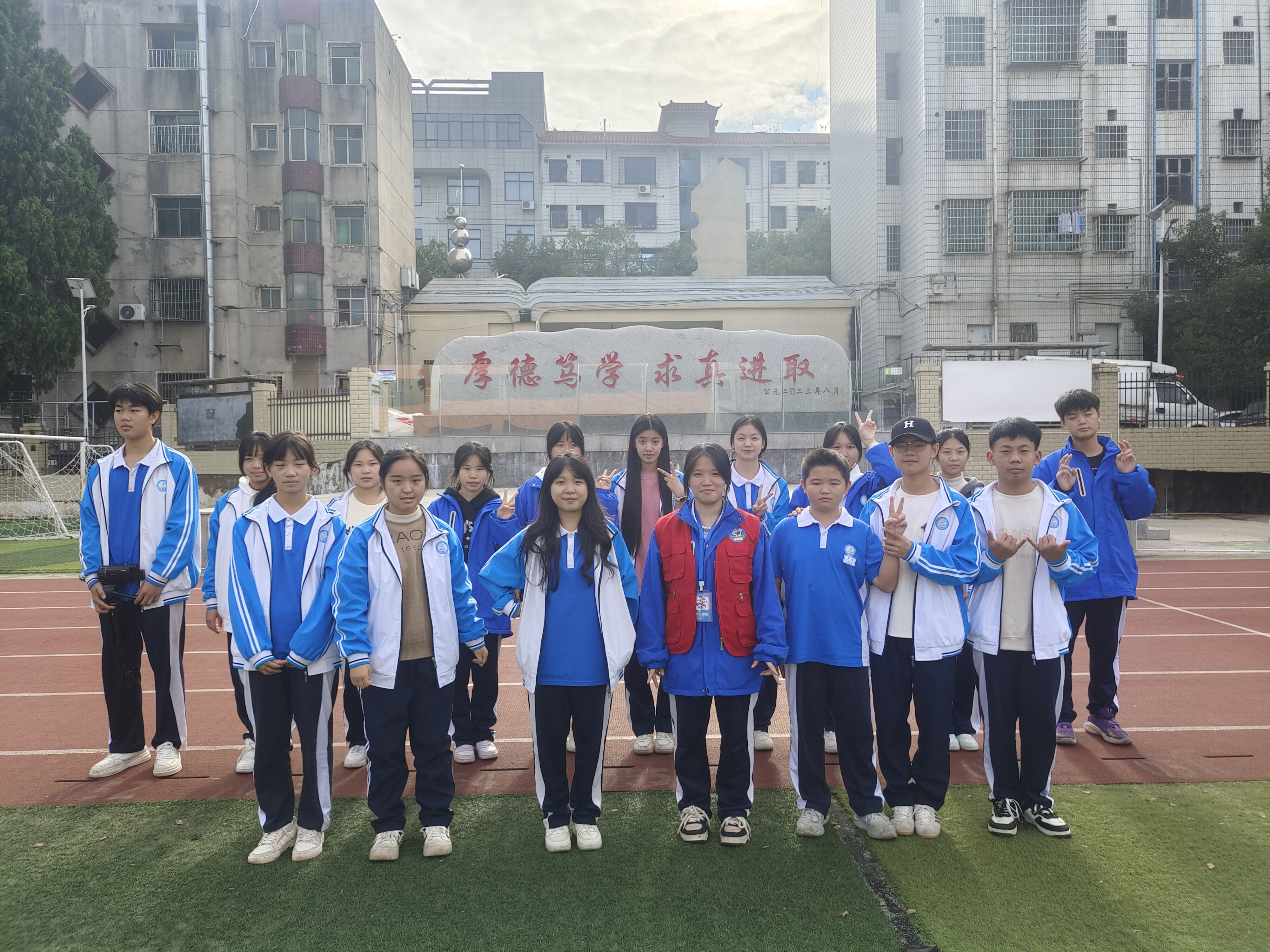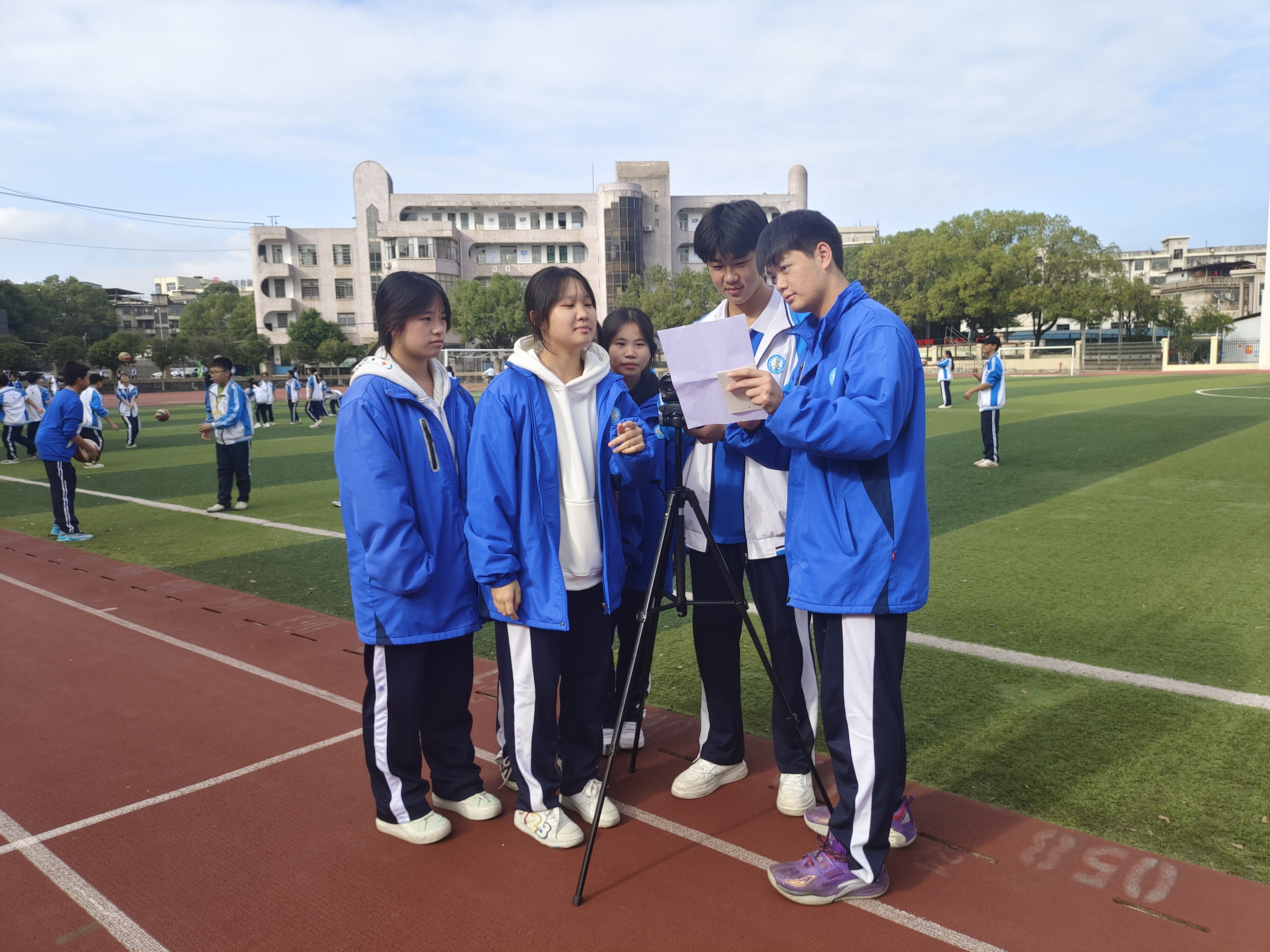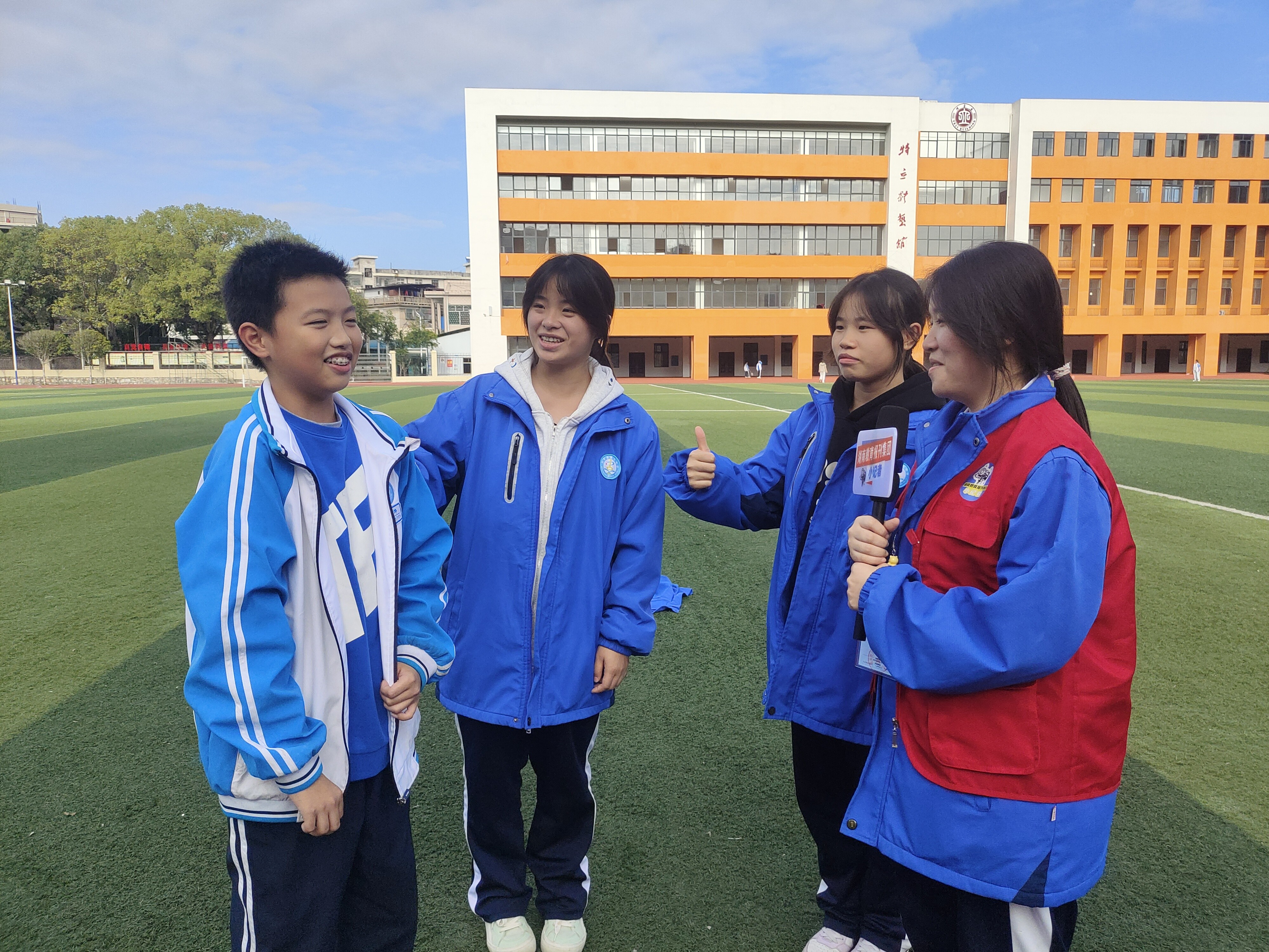 小记者团队的精神风貌,藏在每一次“不将就”的采访里。为全面展现校园跑操比赛的风采,团队提前一周筹备,多轮研讨优化采访提纲、打磨提问逻辑;比赛当日,成员们分工协作、全情投入:有人顶着烈日跟进赛事全程,有人趁师生空闲时段细致访谈,有人就地整理笔记,即便汗湿衣衫仍专注高效。