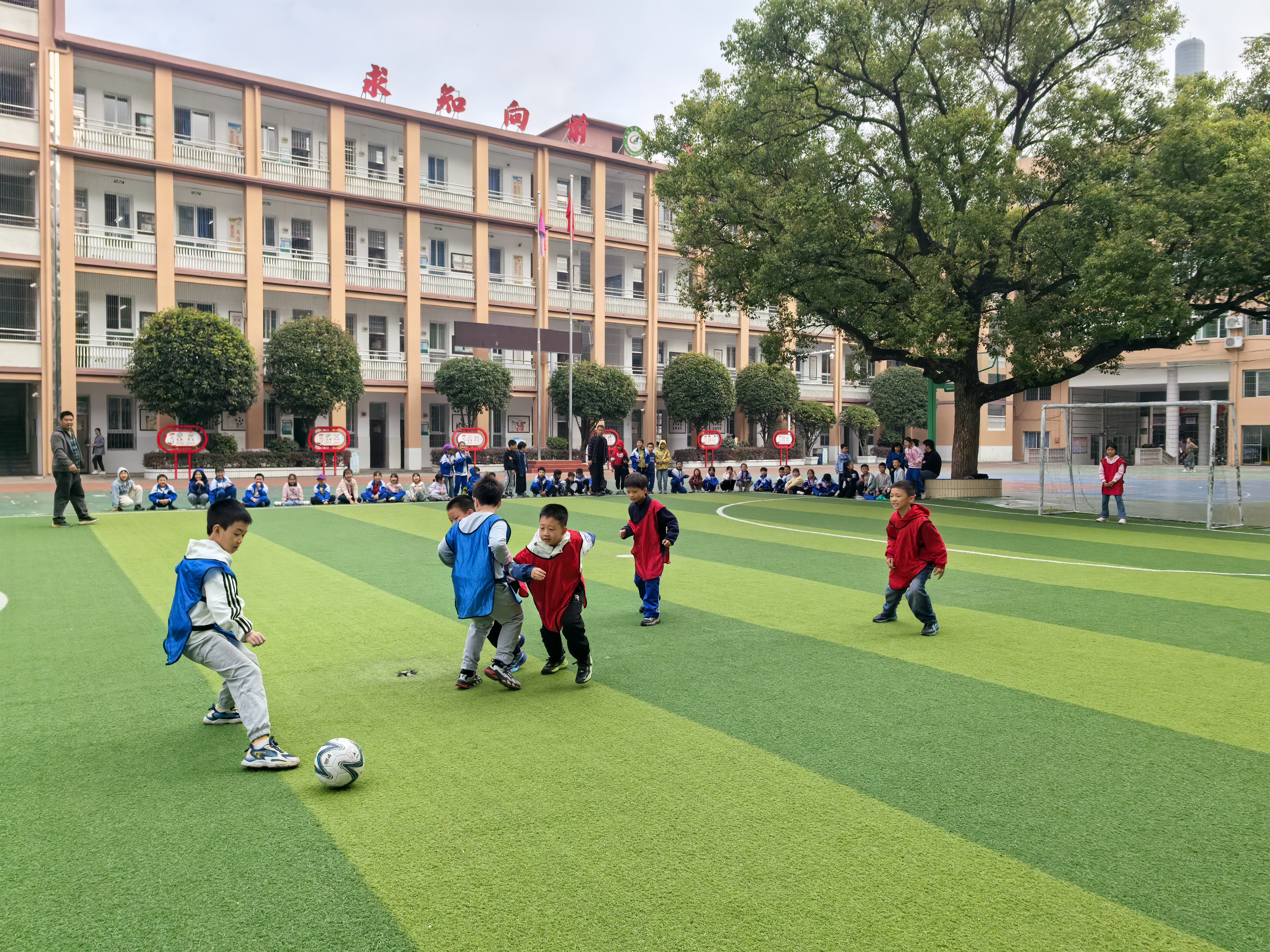 本次赛事根据不同年级学生的特点,设置了富有趣味性和竞技性的项目。一、二年级的小同学们进行了紧张刺激的带球往返跑,他们虽然年纪小,但个个精神抖擞,灵活地带球穿梭,展现了出色的球感和运动天赋。而三至六年级则展开了真刀真枪的班级对抗赛。赛场上,小球员们带球、传球、射门,配合默契,拼抢积极;赛场边,啦啦队的加油声、欢呼声一浪高过一浪,整个校园都沉浸在足球运动带来的欢乐之中。