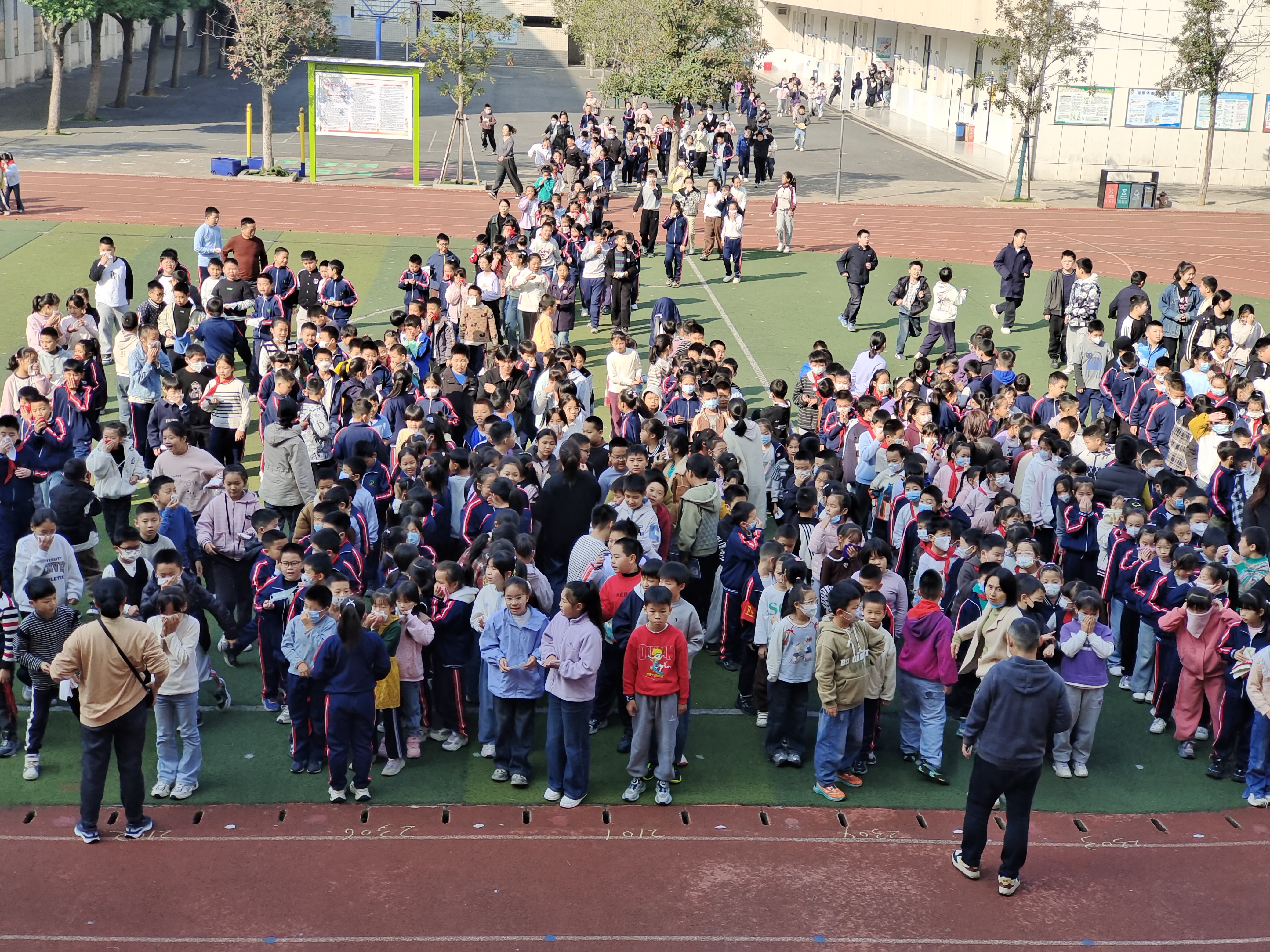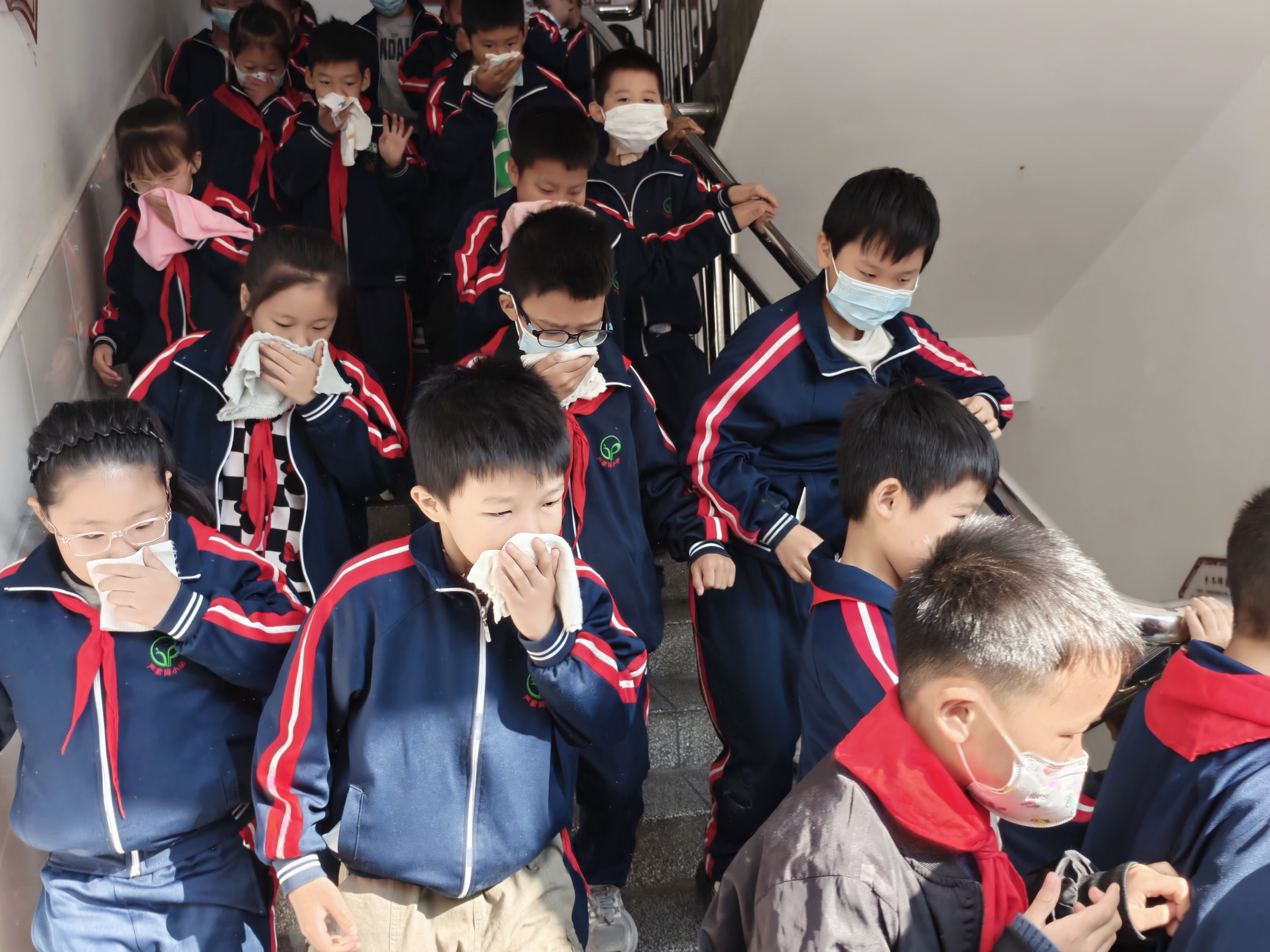听到警报后,各班级当堂教师及班主任迅速组织学生,按照预定疏散路线,用湿毛巾捂住口鼻,弯腰低姿,紧张有序地向操场安全区域撤离。师生配合默契,行动迅速,短短几分钟内,全体师生便安全抵达操场,各班班主任立即清点人数并上报,确保无一名学生遗漏。