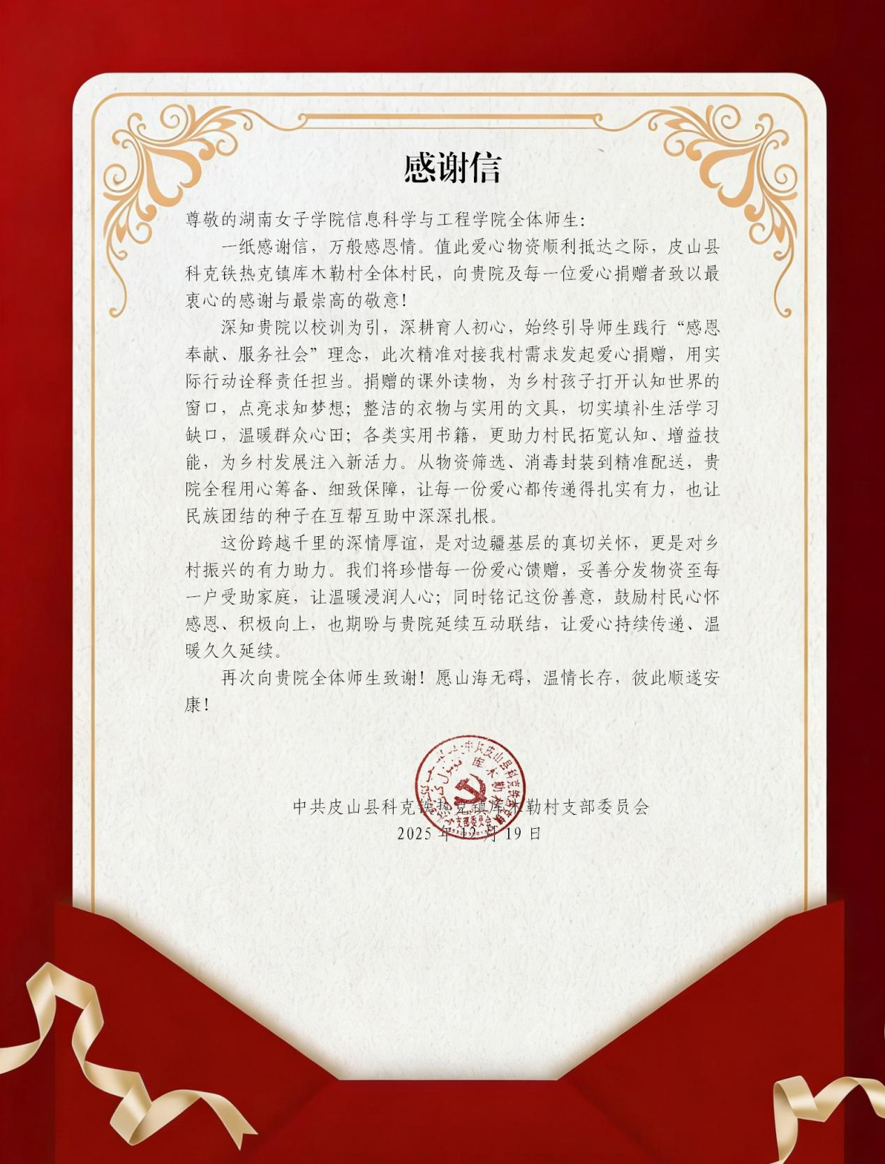 湖南教育新闻网讯(通讯员 黄毅 丁宝琪) 近日,一封来自新疆皮山县科克铁热克镇库木勒村党支部的感谢信,跨越千山万水送达湖南女子学院,字里行间满含对该校信息科学与工程学院师生的真挚谢意,为“懿德传情,旧物暖疆”爱心捐赠活动画上温暖句点。