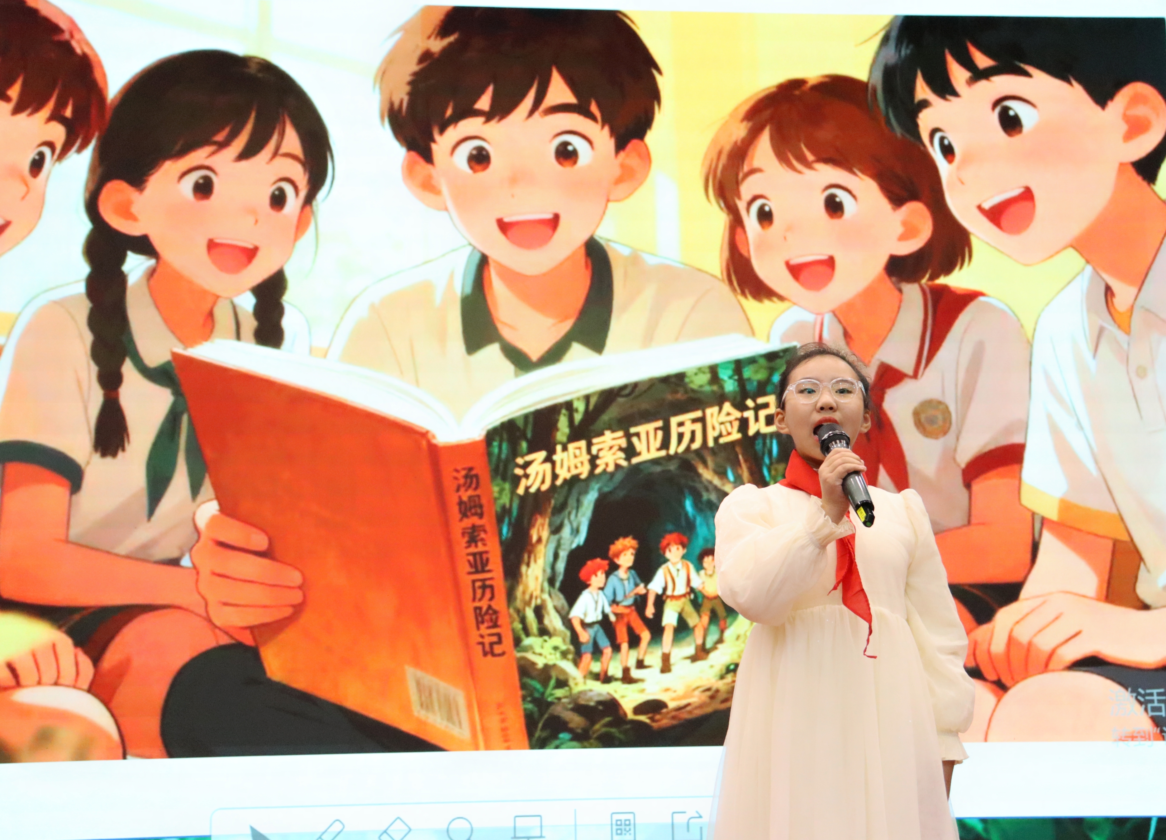 活动现场,选手们或分享经典名著中的深刻哲理,或讲述儿童文学里的动人情节,或介绍科普书籍中的奇妙知识......2101班黄宣铭同学带领观众走进《哈利波特》的魔法世界,2104班任芷萱同学借《汤姆索亚历险记》传递勇气与自由,2002班黄钰涵同学深情解读《三国演义》中忠义与智慧的魅力......他们语言流畅、情感真挚,部分选手还巧妙搭配服装、背景PPT与音乐,让推荐内容更具画面感与感染力,充分彰显了“爱读书、会读书、读好书”的阅读素养,赢得台下阵阵掌声。